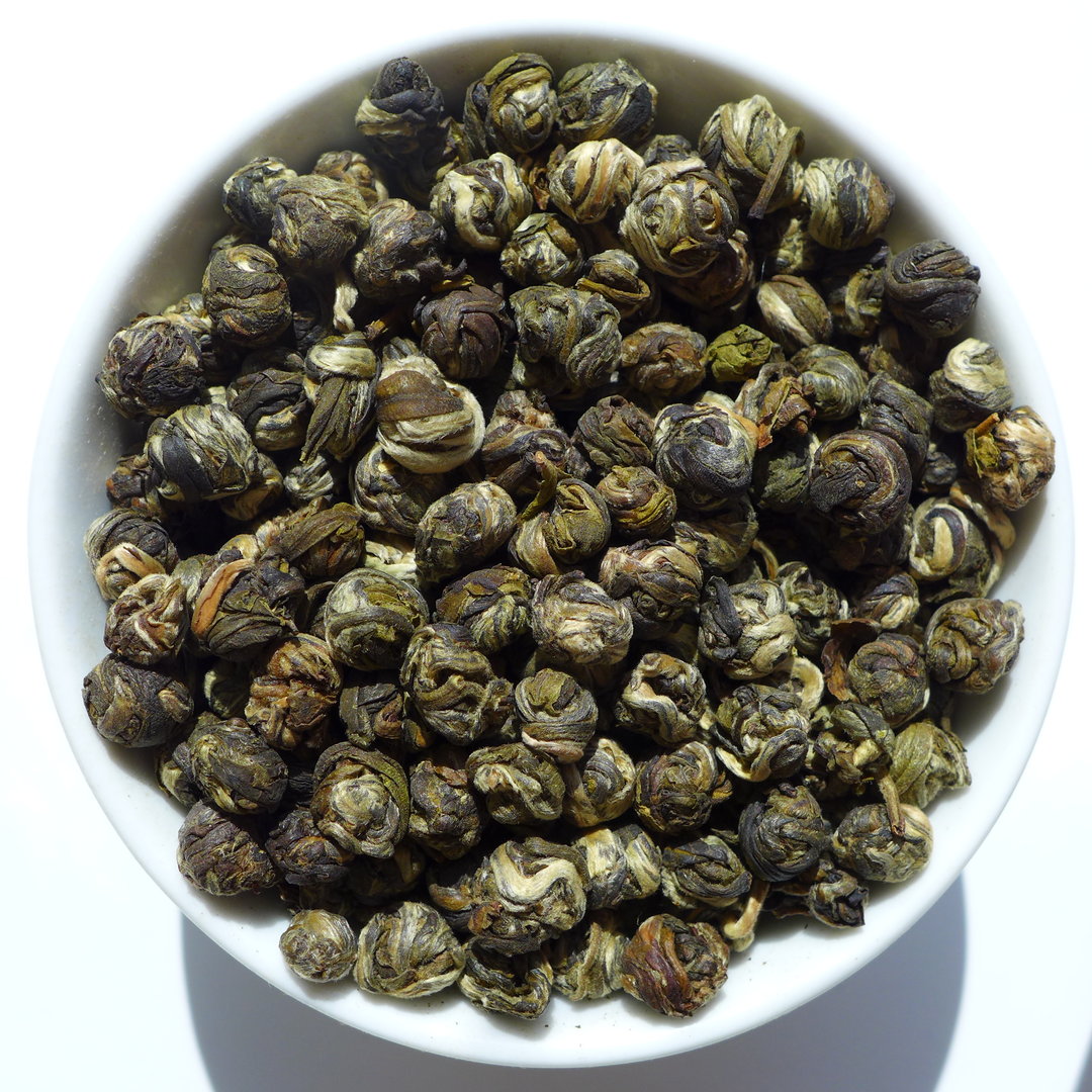 Erläuterung: Teegärten in urwüchsiger Bergnatur, mit frischen Jasminblüten, traditionell von Hand im Wok zu schönstem Kugelblatt gerollt. Zeremonien-Tributtee.