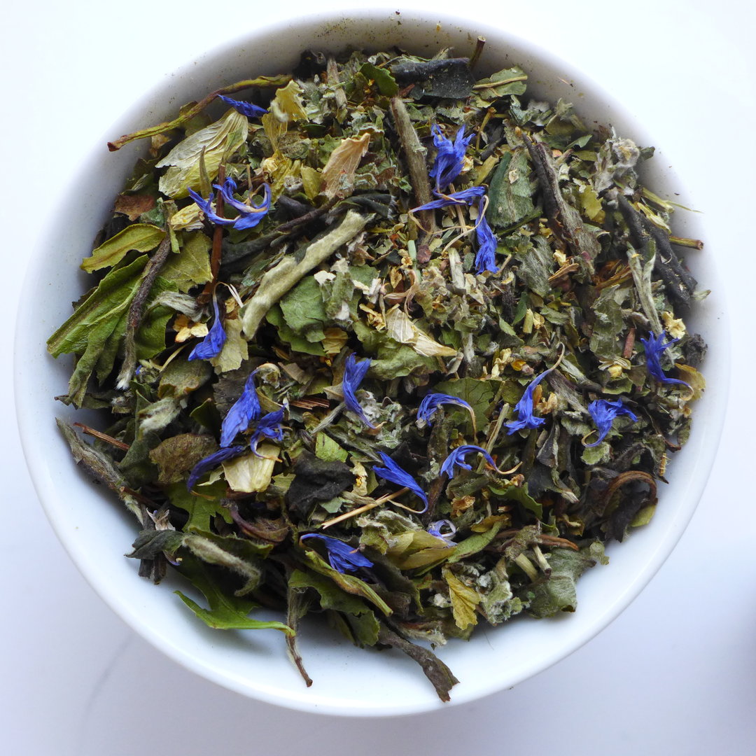 Zutaten: Weißer Tee, Himbeerblätter, Brombeerblätter, Holunderblüten, Melissenblätter, Weißdornblüten und -blätter, Kornblumen-/Malvenblüten, Hopfenblüten, Atlantik Spirulina-Algen, natürliches Aroma.