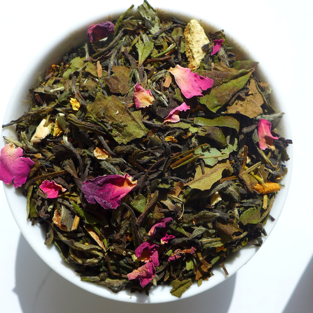 Zutaten: Grüner und Weißer Chinatee, Orangen-, Zimt-, Zitronenstücke, indische Gewürze, natürliche Aromen.