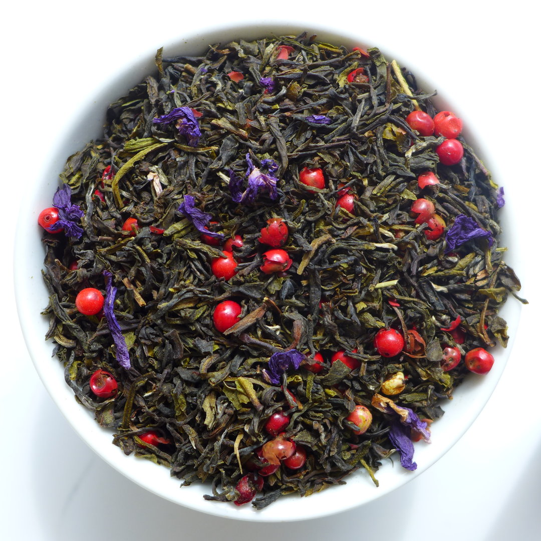 Zutaten: Grüner Darjeeling*, Rosa Pfeffer 2 %, Kornblumen-/Malvenblüten*. (*=aus kontrolliert biologischem Anbau)
