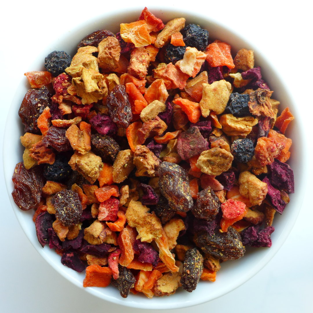 Herkunft: erntefrische TEEhaus-Mischung. Zutaten: Äpfel, Karotten, Rote Bete, Weinbeeren, Erdbeerstücke 6 %, natürliche Aromen.