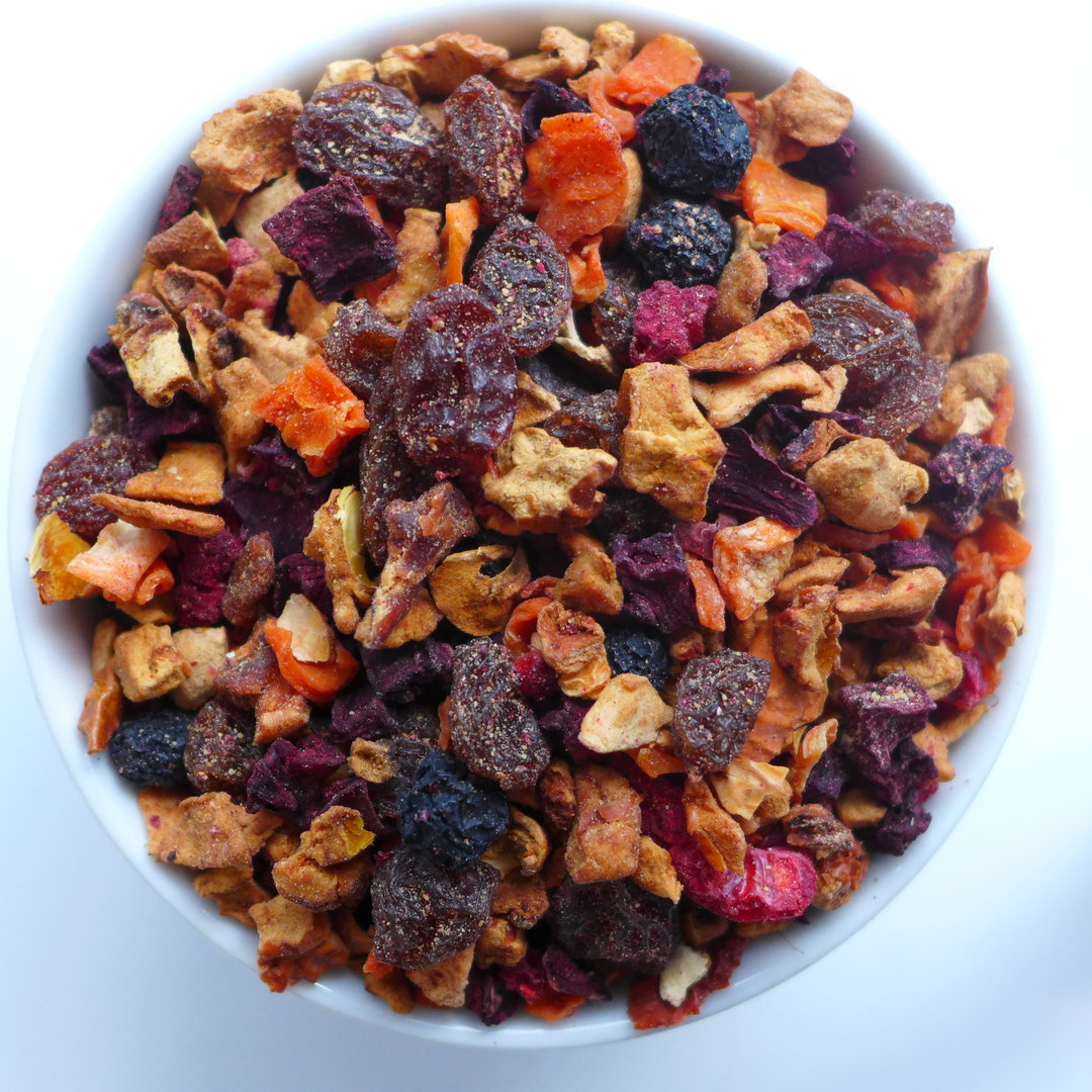 Herkunft: erntefrische TEEhaus-Mischung. Zutaten: Apfel 20 % (Zitronensäure), Ananas und Papaya (kandiert), Rote Beete, Zimtstangen 4 %, Aroma, Weinbeeren, Kokoschips (Zucker),...