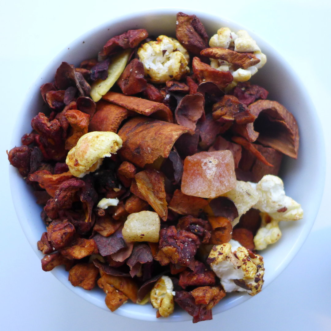 Zutaten: Apfel 20 % (Zitronensäure), Ananas und Papaya (kandiert), Rote Beete, Zimtstangen 4 %, Aroma, Weinbeeren, Kokoschips (Zucker), gebrannte MANDELN 4 % (Zucker 2 %), Popcorn (Mais, Zucker, Rapsöl).