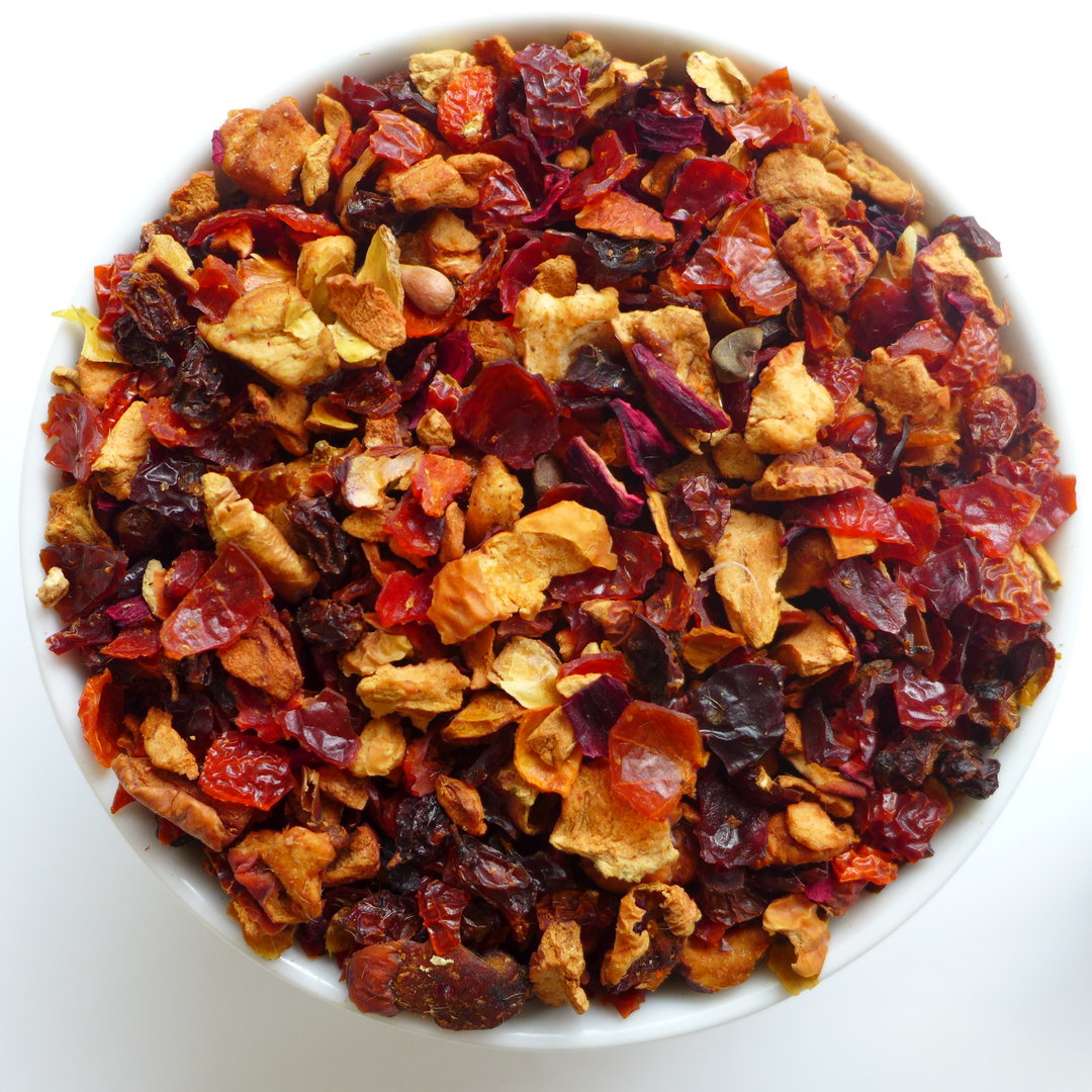 Zutaten: Hagebutte, Apfelstücke 65 %, Sanddornbeere 10 %, Hibiskus, natürliches Aroma.