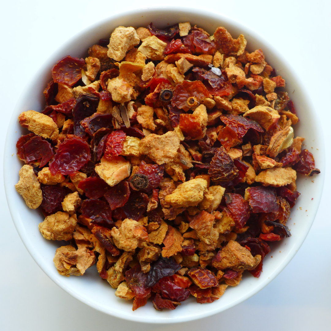 Herkunft: erntefrische TEEhaus-Mischung. Zutaten: Apfelstücke 70 %, Hagebuttenschalen, Zimtstücke 3 %, natürliches Aroma.