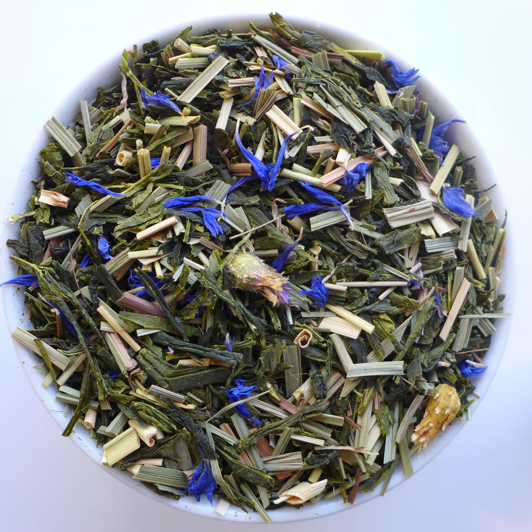 Zutaten: Sencha Grüntee* 62 %, Lemongras* 26 %, Kornblumen-*/Malvenblüten*.