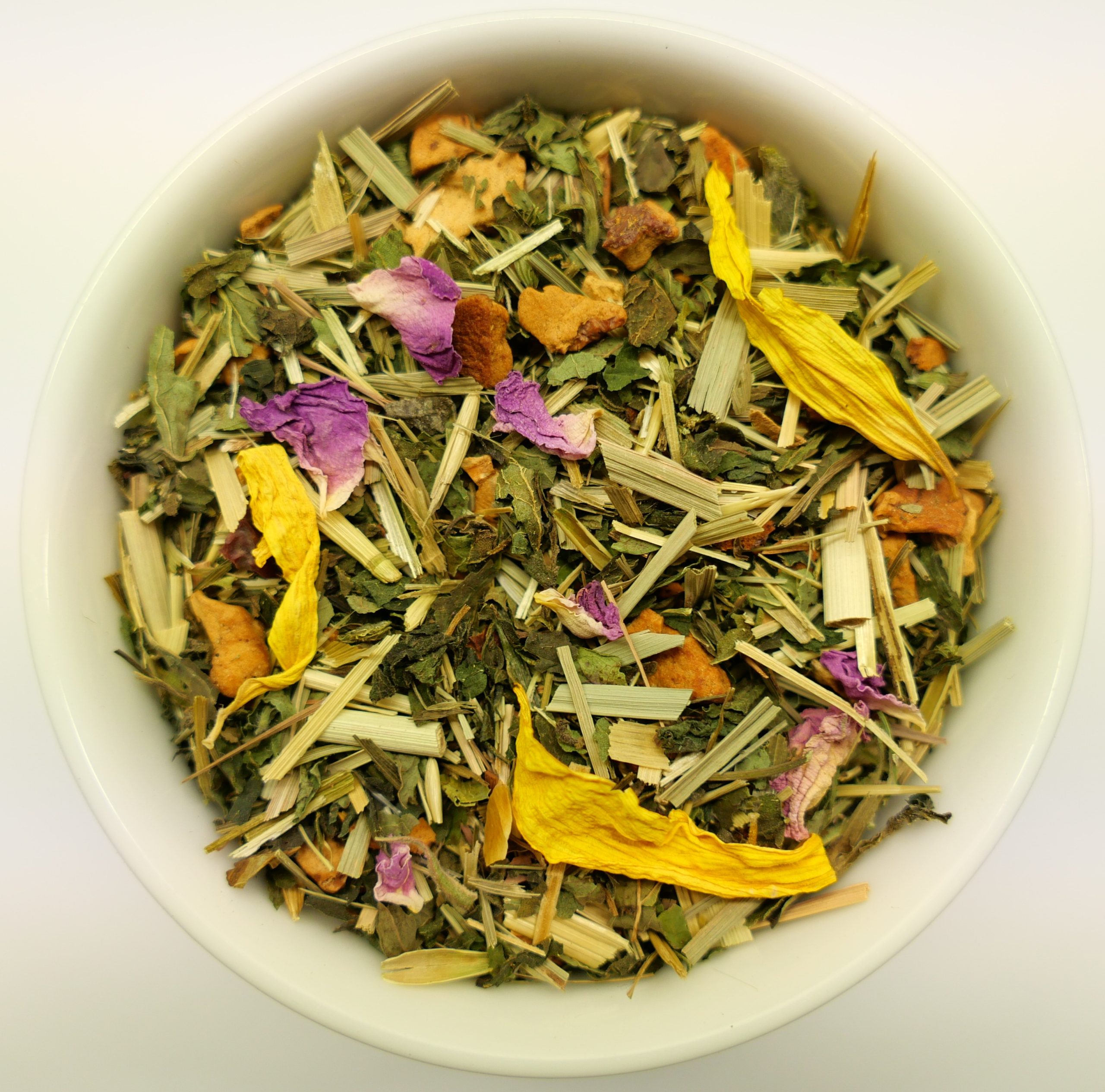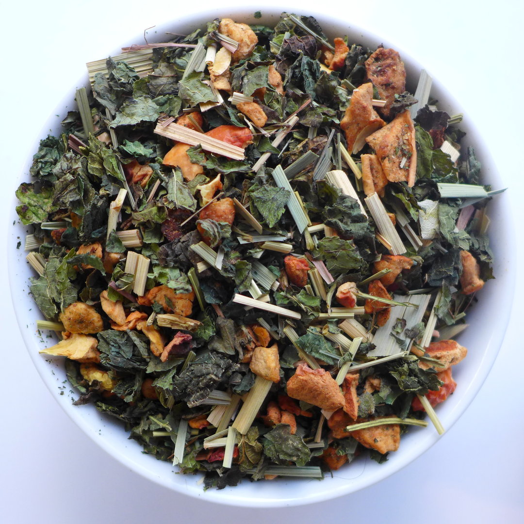 Zutaten: Apfelstücke*, Honeybush*, Brennnesselblätter*, Grünhafer*, Lemongras*, Melissenblätter*, Rosenknospen*. (* = aus kbA Bio-Anbau)