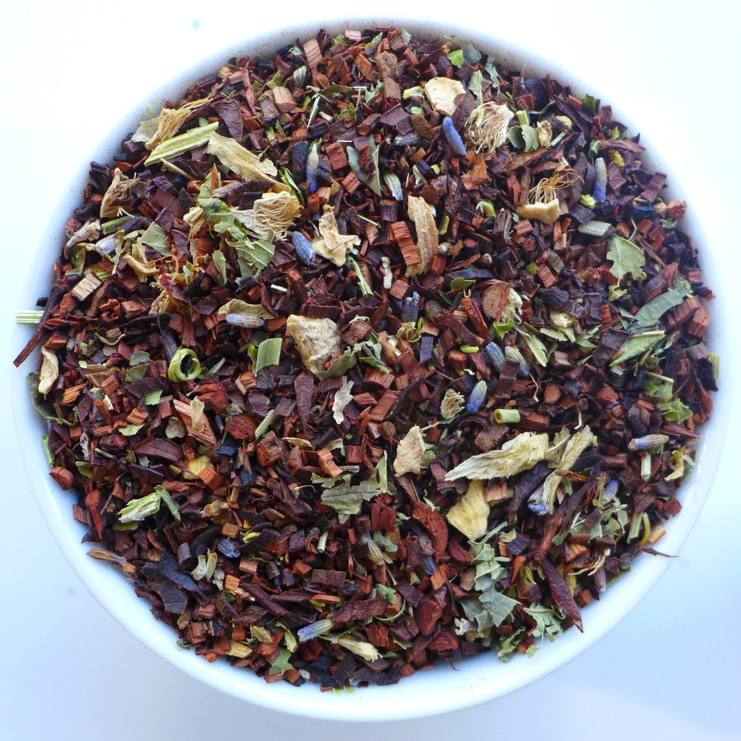 Zutaten: Honeybush, Gewürze, Ingwer, Passionsblumenkraut, Lavendelblüten, Zitronenverbene, natürliches Aroma.