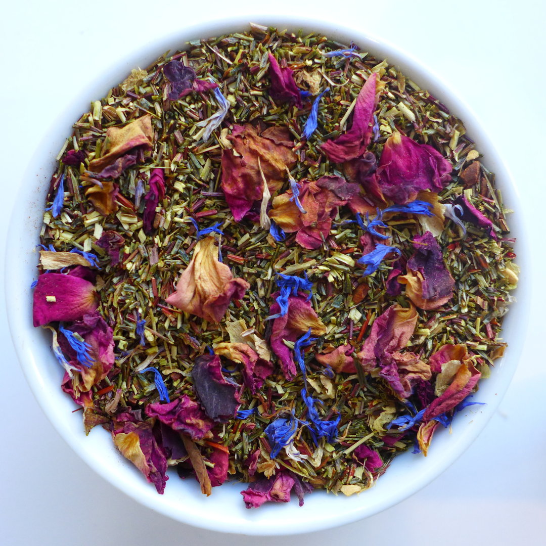 Zutaten: Premium Rooibos-Tee Grün long cut, Rosenblüten, Gewürze, Kornblumen-/Malvenblüten, natürliche Aromen.