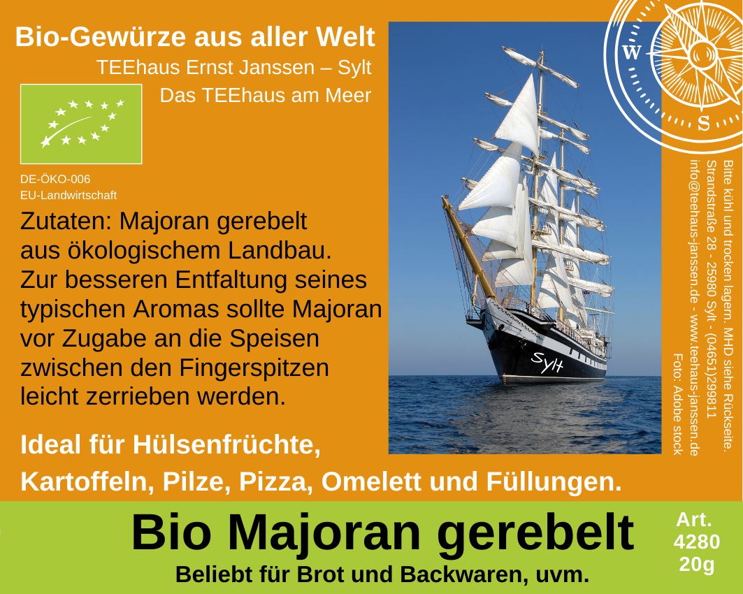 Zutaten: Majoran gerebelt aus ökologischem Landbau. Zur besseren Entfaltung seines typischen Aromas sollte Majoran vor Zugabe an die Speisen zwischen den Fingerspitzen leicht zerrieben werden.