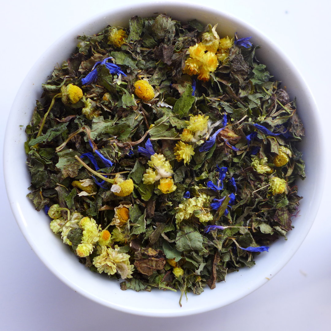 Zutaten: Melisse*, Kamillenblüten* 5 %, Kornblumen-*/Malvenblüten*.