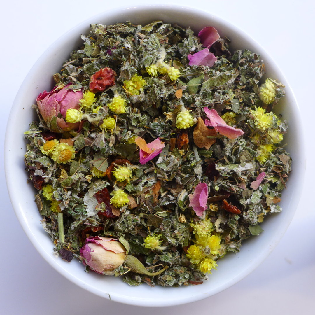 Zutaten: Himbeerblätter*, Fenchel*, Hagebutte*, Brombeerblätter*, Apfel*, Holunderblüte*, Anis*, Melisse*, Minze*, Rosenblüte*. (* = aus kbA Bio-Anbau).