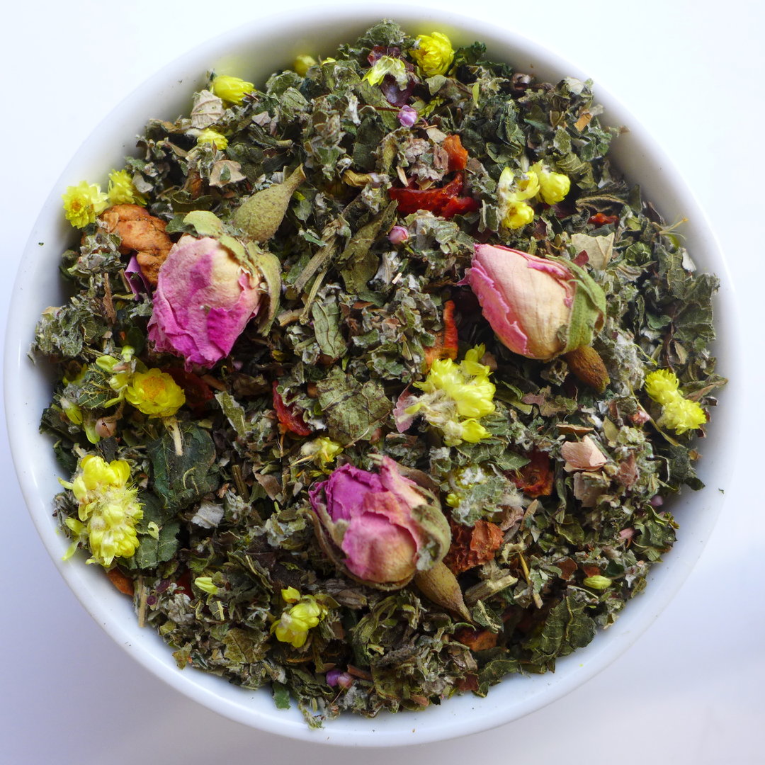 Zutaten: Himbeerblätter, Hagebutten, Brennnessel, Brombeerblätter, Apfel, Melisse, Rosenknospen, natürliches Aroma.