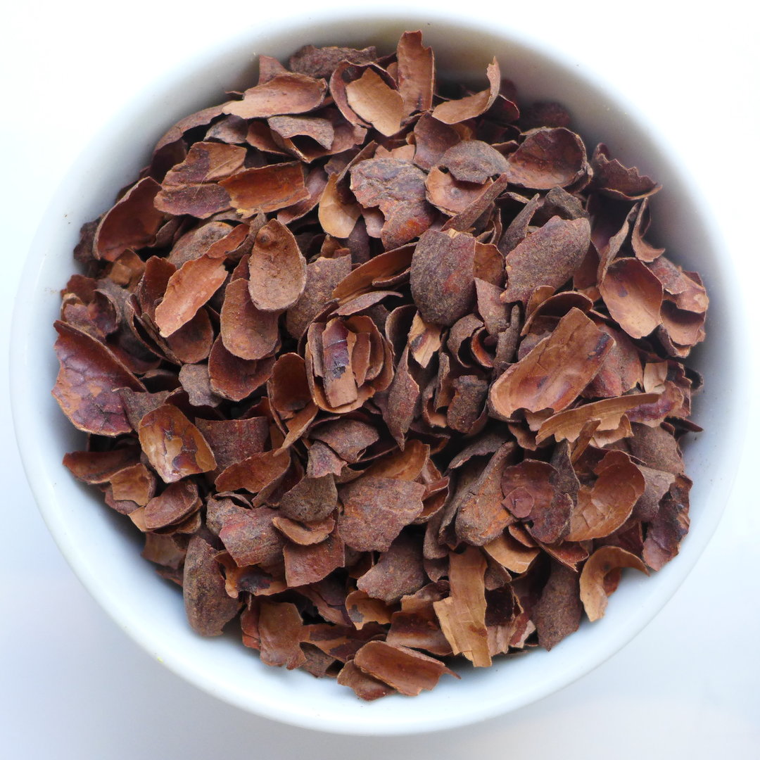 Erläuterung: Die getrockneten Schalen der Kakaobohne enthalten nur wenig Koffein. Geschmacksgebende Verwendung in z. B. Kräutermischungen.