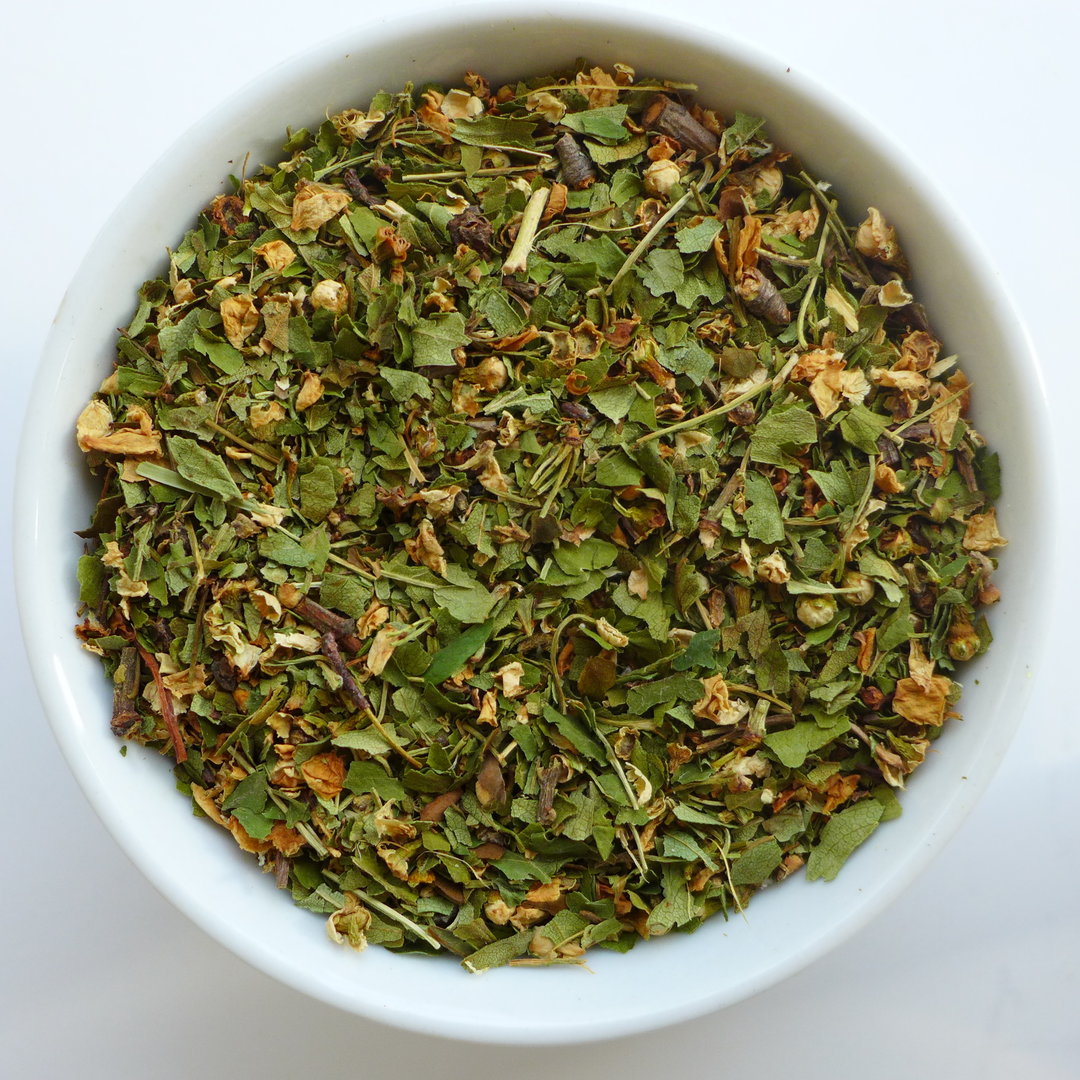 Herkunft: erntefrische TEEhaus-Kräutermischung. Zutaten: Weißdornblätter und -blüten, Rooibos Grün, Rooibos Rot, Gewürze, natürliches Aroma. Leicht honigduftige, würzige Tasse.
